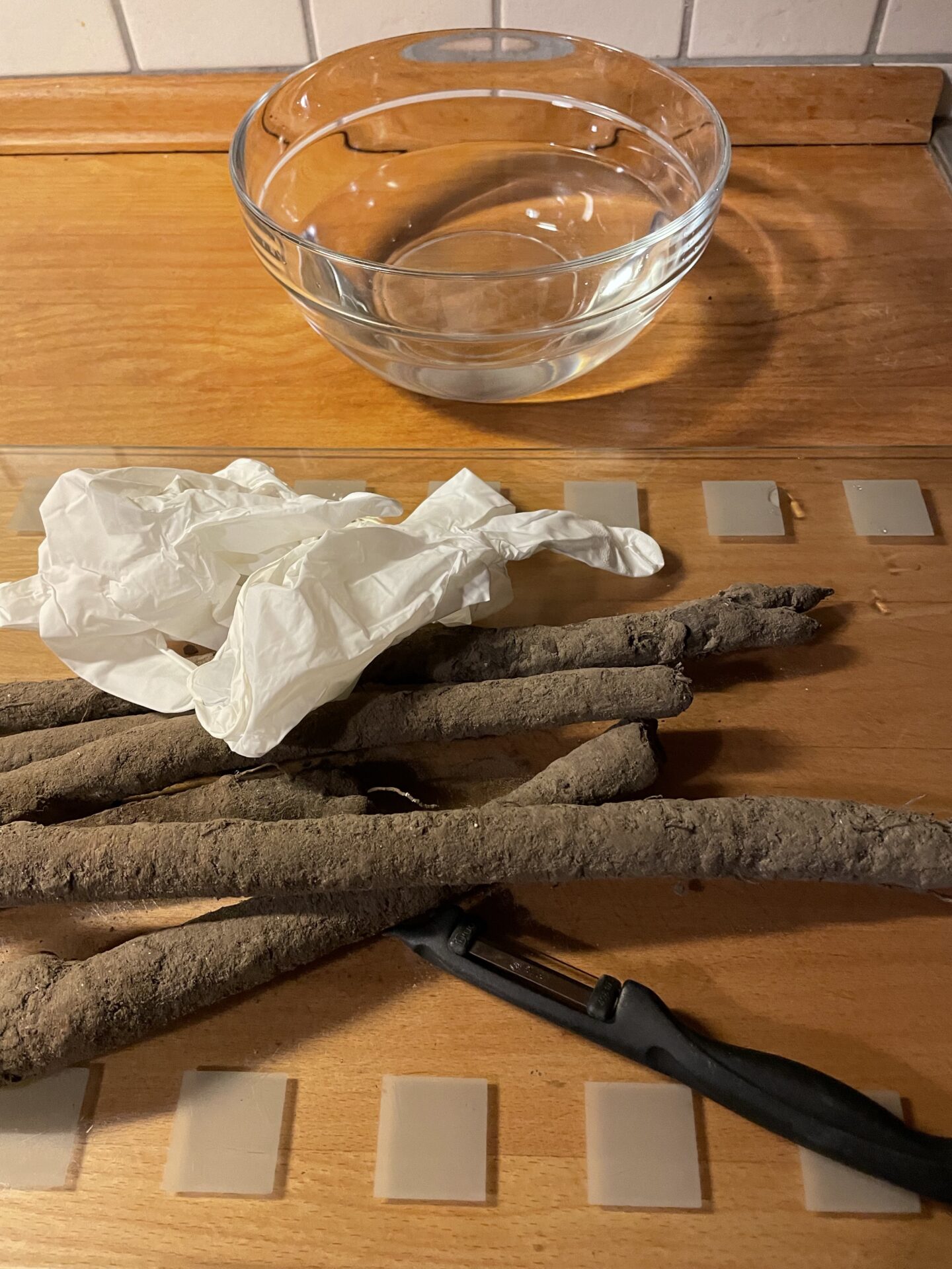 Schwarzwurzeln abwaschen und schälen, dabei am bestem Gummihandschuhe tragen, damit der austretende Saft nicht die Hände verfärbt.