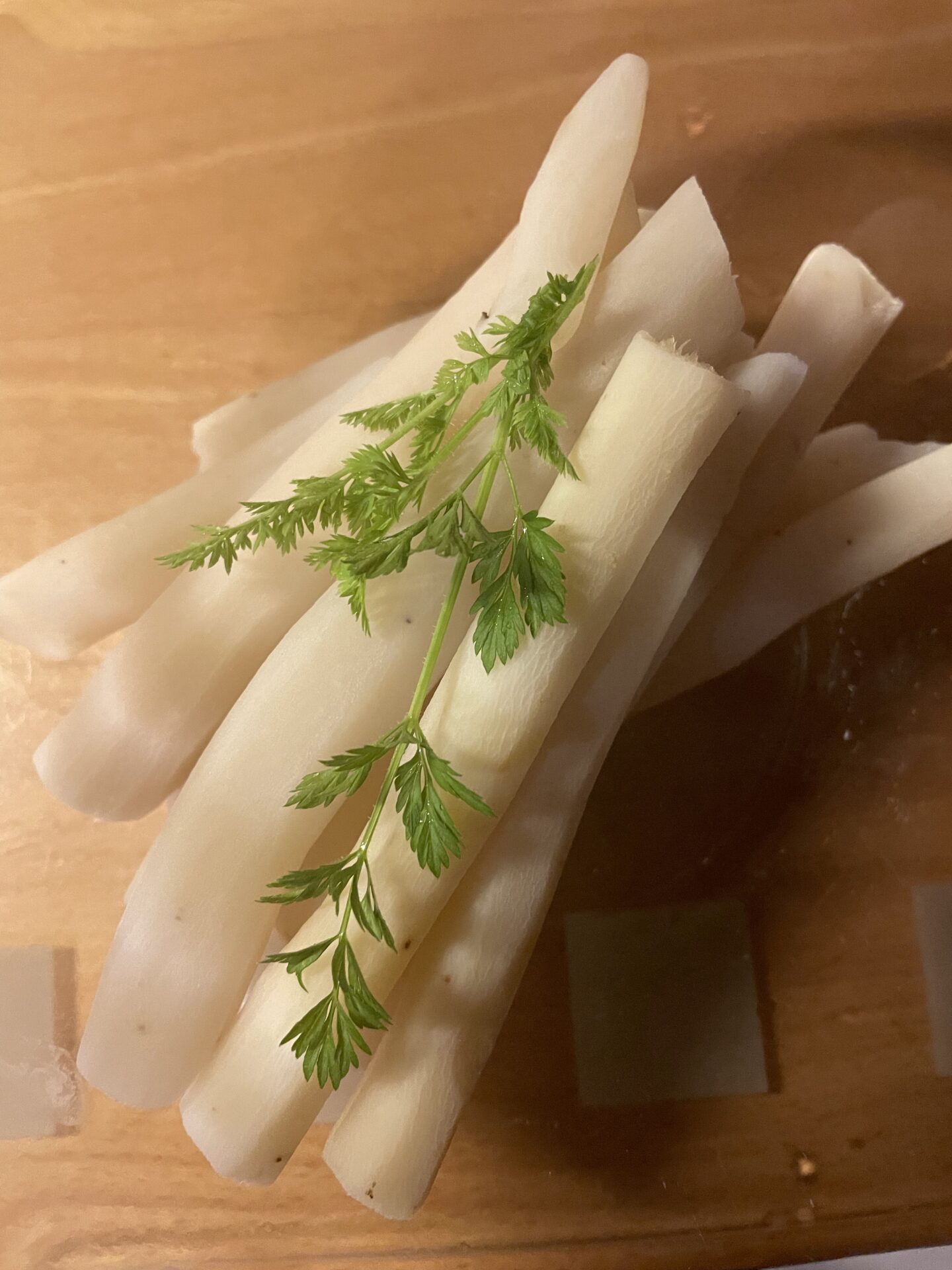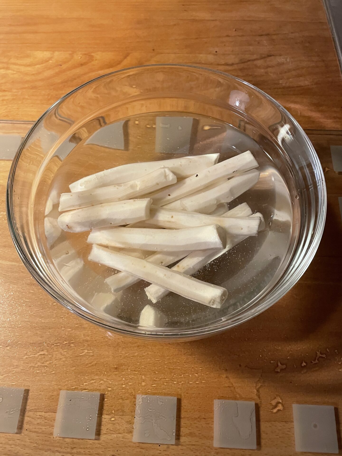 Die geschälten Schwarzwurzeln in eine Schale mit Wasser legen. Vorher einen Spritzer Essig ins Wasser geben, damit die Stangen schön hell bleiben.